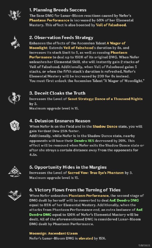月兆·满辉:施放元素战技弈术·千夜一舞时,将使当前场上的草原核与丰穰之核转化为「诳言之核」,且附近所有角色在接下来的15秒内触发月绽放反应时,将取代草原核与丰穰之核产生诳言之核。诳言之核无法触发超绽放与烈绽放反应,也无法迸发。 奈芙尔施放重击或幻戏时,可以吸收附近一定范围内的诳言之核,每吸收一枚诳言之核,奈芙尔便会获得一层「伪秘之帷」效果;该效果叠加至3层或3层的持续时间刷新时,奈芙尔的元素精通提升100点,持续8秒。